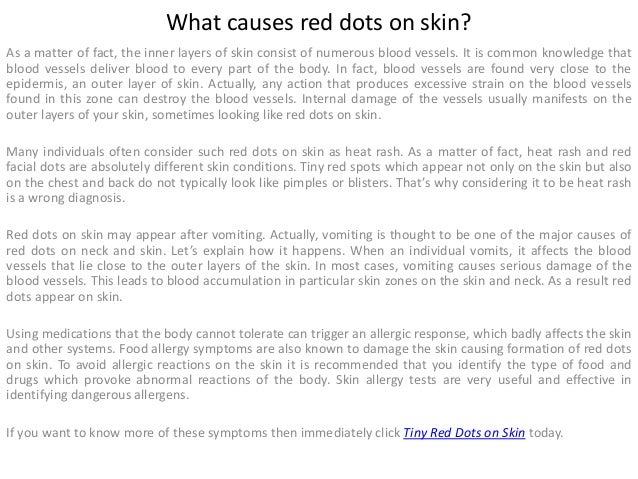 Could tiny red spots on skin be a sign of leukemia? Here is a closer look at the blood spots on skin with focus on red, raised, pictures, causes and how to get rid of them. Skinkraft puts together all the causes, ways to this may result in the appearance of tiny red bumps on the surface of your skin. Red spots or rashes on the skin may be associated with other symptoms like pain and itching or affected person can be absolutely asymptomatic any kind of spots appearing on or beneath skin should raise an alarm to the person. Red spots on skin can have many causes. Bleeding disorders can also lead to the formation of. Red spots on your skin could be caused by cherry angiomas, papular eczema, acne—the list is long, but treatments are plentiful. Inflammatory reactions often trigger an increase in blood flow. Red spots on the skin are usually small and may appear on the chest, face, arms, legs, and other areas of the body. According to some investigators, these red moles are inherited and thus controlled genetically. They are often small, little, tiny or pinpoint and may be itchy or not itchy. In some cases, they may appear as red spots filled with blood under the skin. Allergies, infections, skin irritation, and bites are common causes of red spots on the skin.